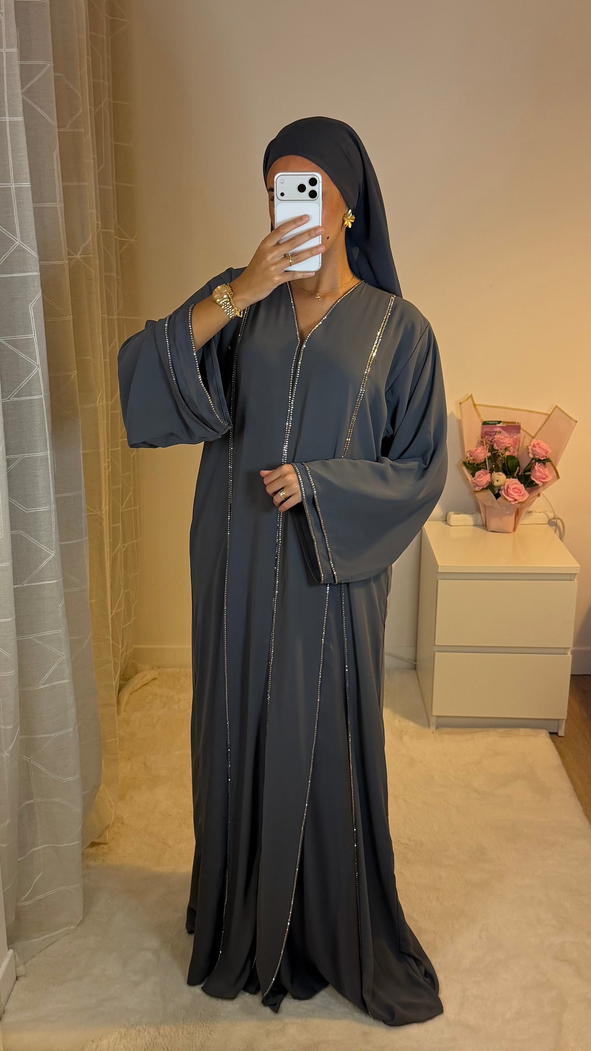 Élégante et fluide, l’abaya Alira séduit par ses lignes discrètement ornées et son tissu gris raffiné. Vendue avec son hijab assorti, elle allie modestie et élégance ✨